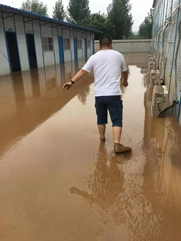 在洪災(zāi)期間,項(xiàng)目部水位高達(dá)2.8米,生活及辦公區(qū)域一樓所有的設(shè)備、設(shè)施全部泡水,施工現(xiàn)場(chǎng)臨時(shí)道路被水沖壞、臨時(shí)圍擋坍塌近150米。
