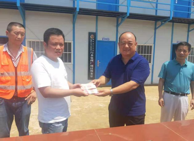 7月31日上午,在河南銀龍房地產(chǎn)開(kāi)發(fā)有限公司董事長(zhǎng)曹中印、總經(jīng)理方迪的帶領(lǐng)下,周口銀龍水務(wù)有限公司董事長(zhǎng)張尚政、總經(jīng)理郁志強(qiáng)、周口上善水務(wù)有限公司董事長(zhǎng)張建華、夏邑縣聰辰自來(lái)水有限公司董事長(zhǎng)張建新、河南銀龍鹿邑供水有限公司總經(jīng)理陳樂(lè)、鹿邑直飲水公司總經(jīng)理王明亮等同志頂著炎炎烈日帶著各公司的愛(ài)心捐款和慰問(wèn)物資來(lái)到鶴壁寶山生物化工園區(qū)污水廠項(xiàng)目施工現(xiàn)場(chǎng),慰問(wèn)前幾天被大雨洪澇沖刷受到影響的一線員工們,貼心地詢問(wèn)和安慰每位員工。