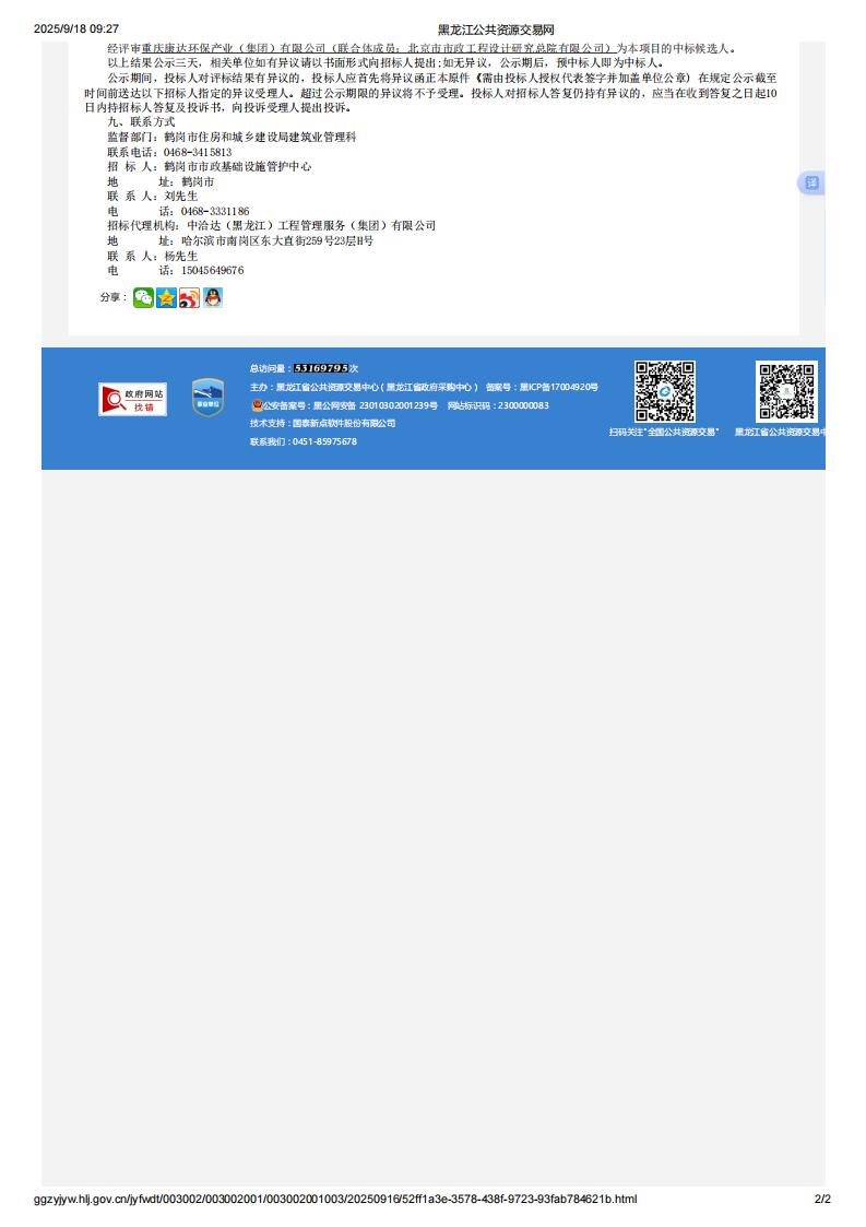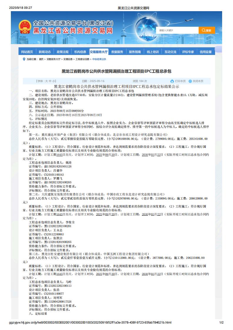 黑龍江省鶴崗市公共供水管網(wǎng)漏損治理工程項(xiàng)目EPC工程總承包中標(biāo)結(jié)果公示